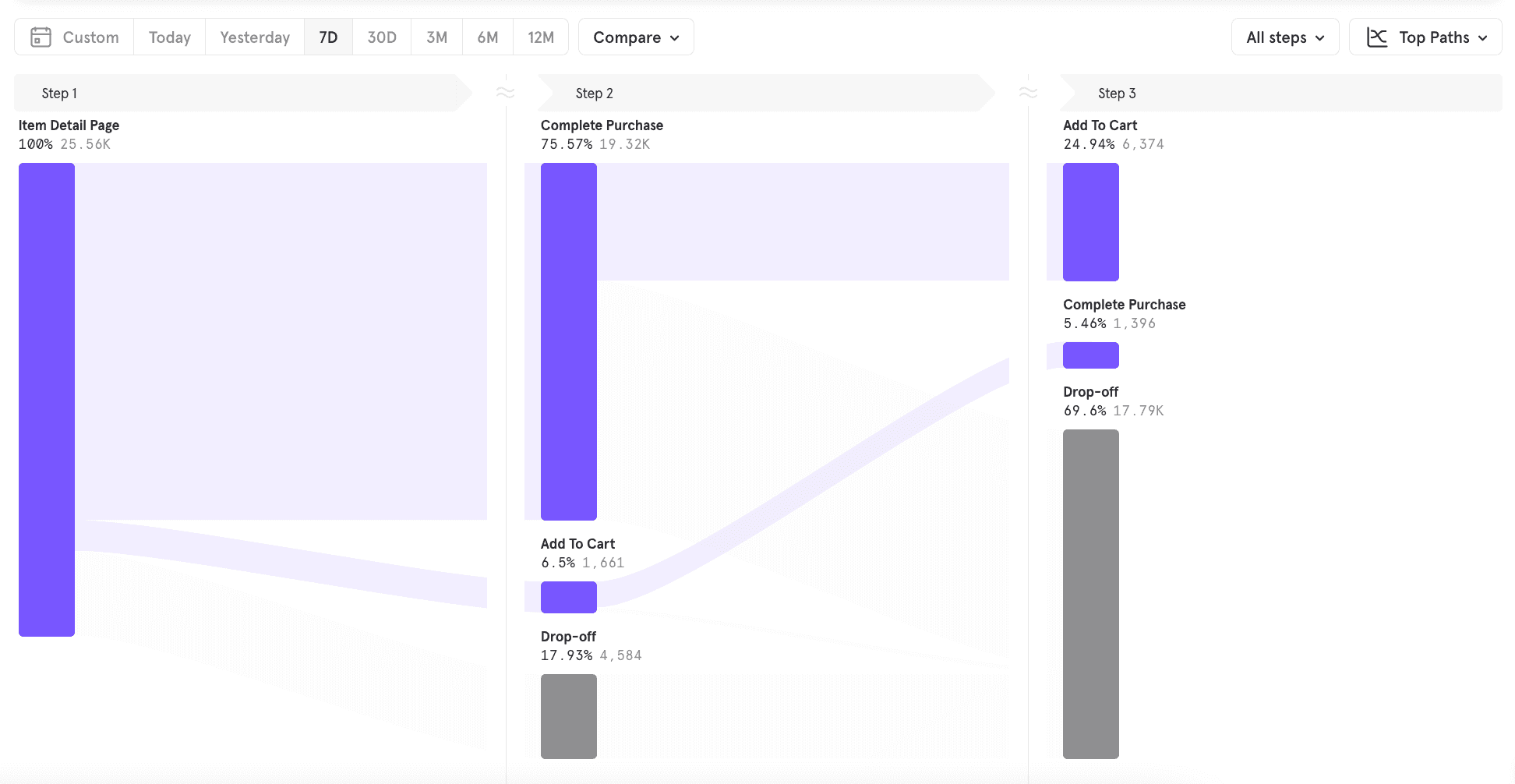 For example, if your product was an e-commerce retail company and you want to understand if users who browse for additional products between adding something to their cart and checking out are less likely to complete a purchase. To answer this question, you could create a funnel with three steps: