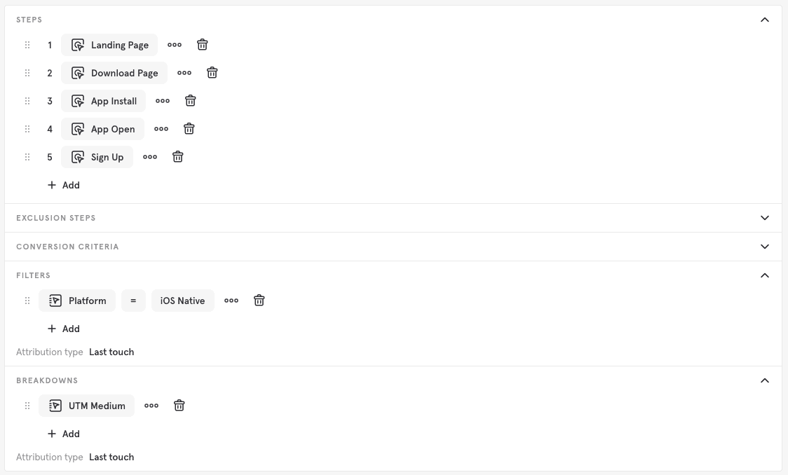 Breakdowns segment data into groups. In this case, we want to break our funnel down by marketing medium, tracked via UTM tags. Therefore, add a "UTM Medium" breakdown. At this point, your query should look like this: