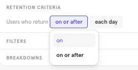We think "On or After" retention is a better fit for most businesses and it is the default calculation for the Retention report. This is because it’s more common that a product doesn’t require users to come back in each time unit to achieve the product’s value proposition, and more often than not when doing retention analysis we don’t only value the user coming back in a specific time unit as long as they eventually do. However, if this is important to you and your business, please utilize "On" Retention.